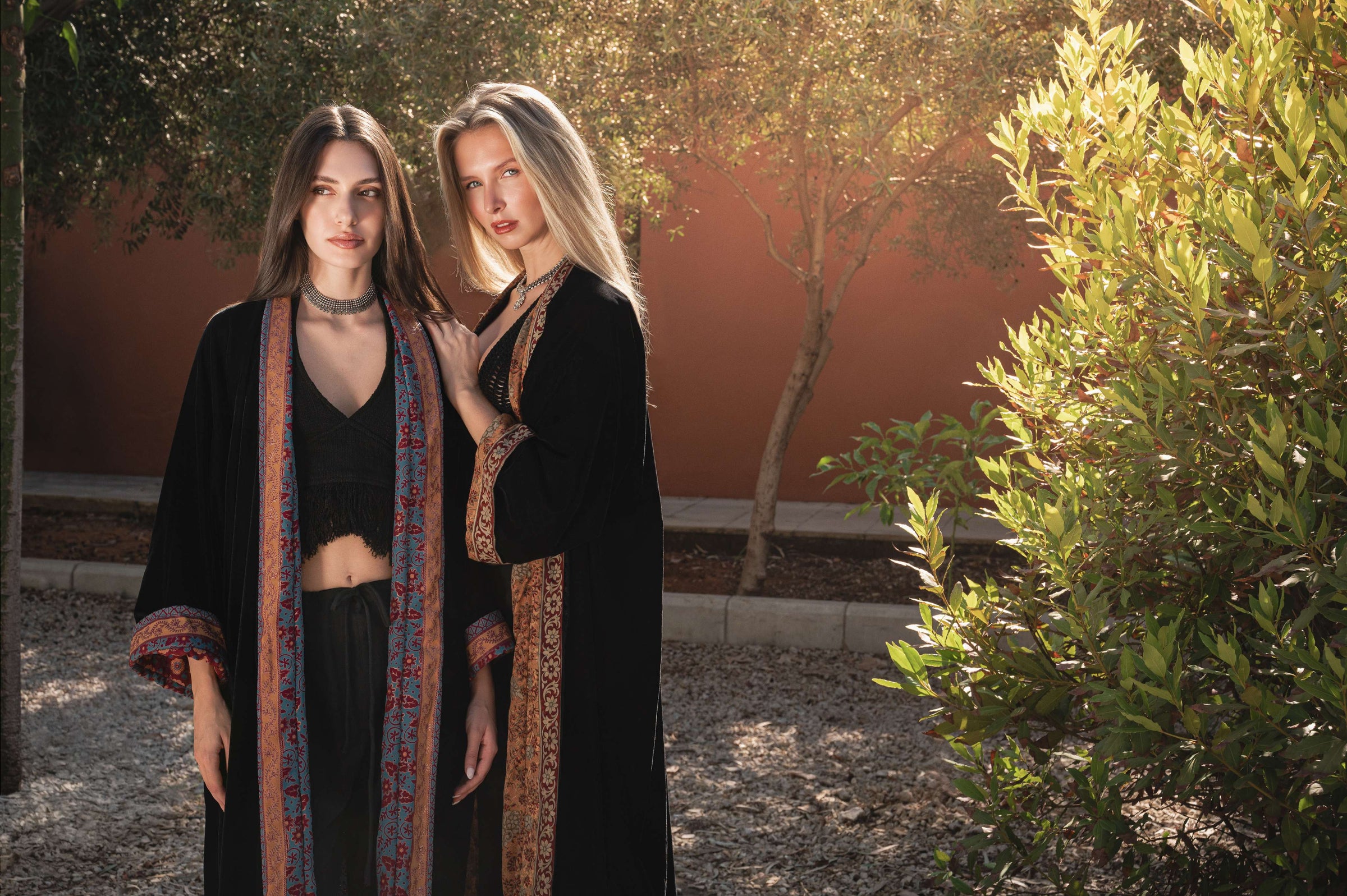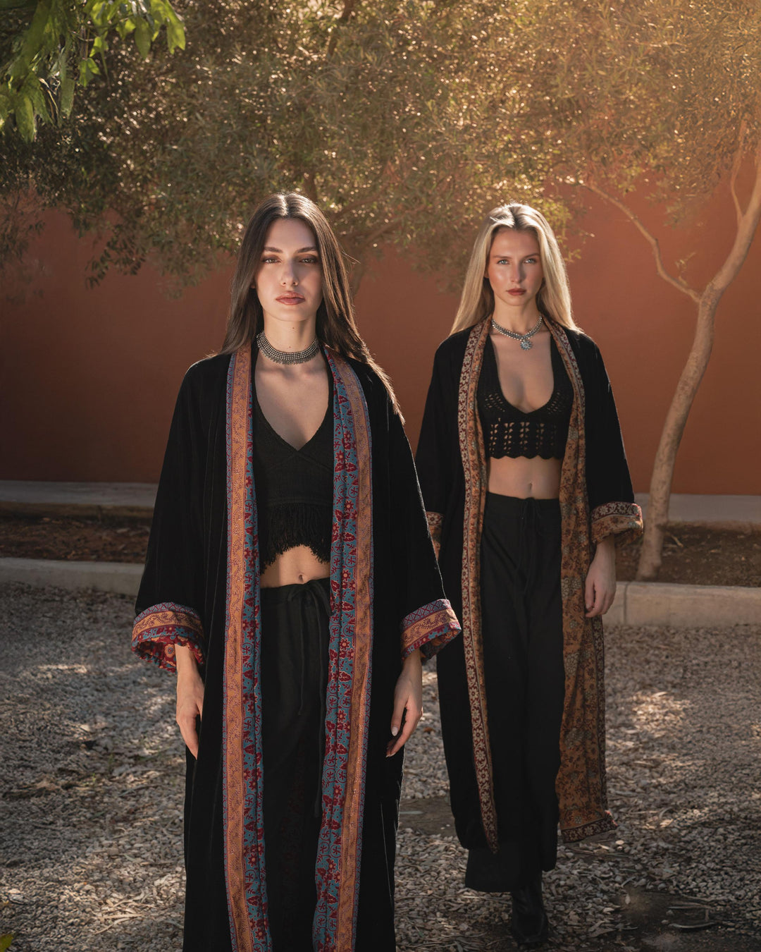 Rich velvet outside, silk hidden within. Each piece is one of a kind, belted at the waist for an effortlessly graceful silhouette.