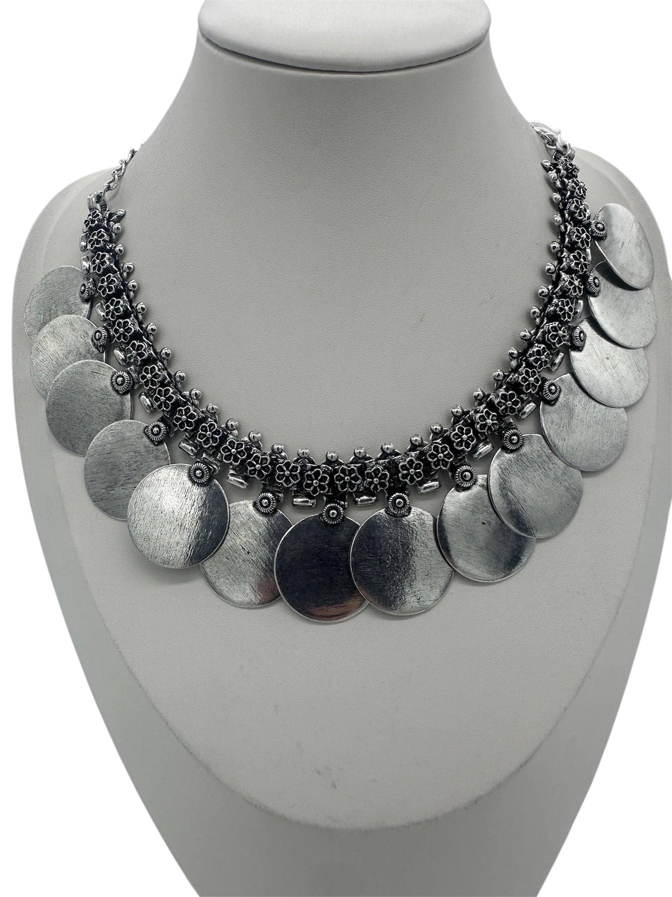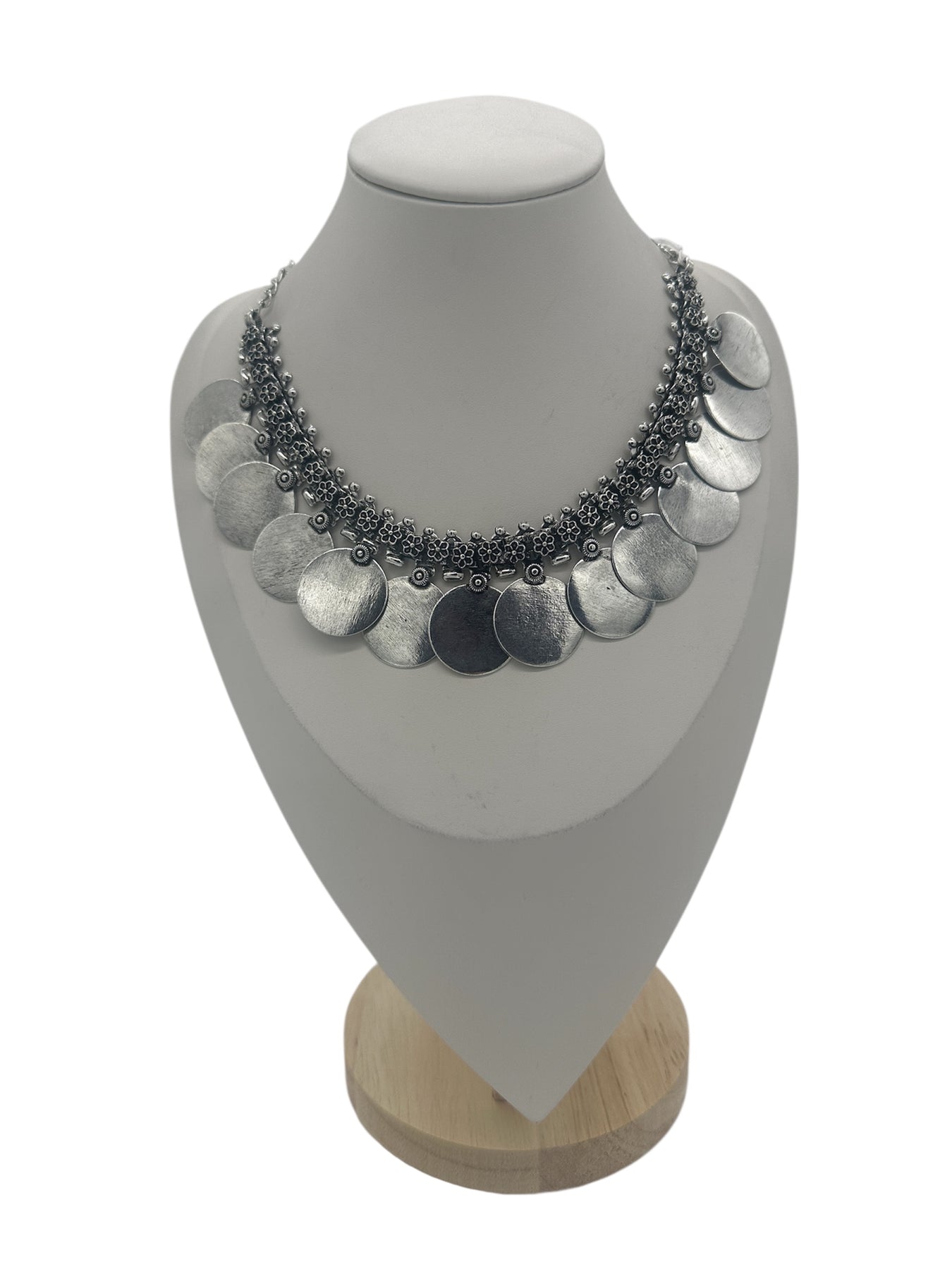 A bold, handcrafted statement necklace featuring detailed elements and cascading rods for a boho-chic finish. Lightweight, eye-catching, and nickel-free.
